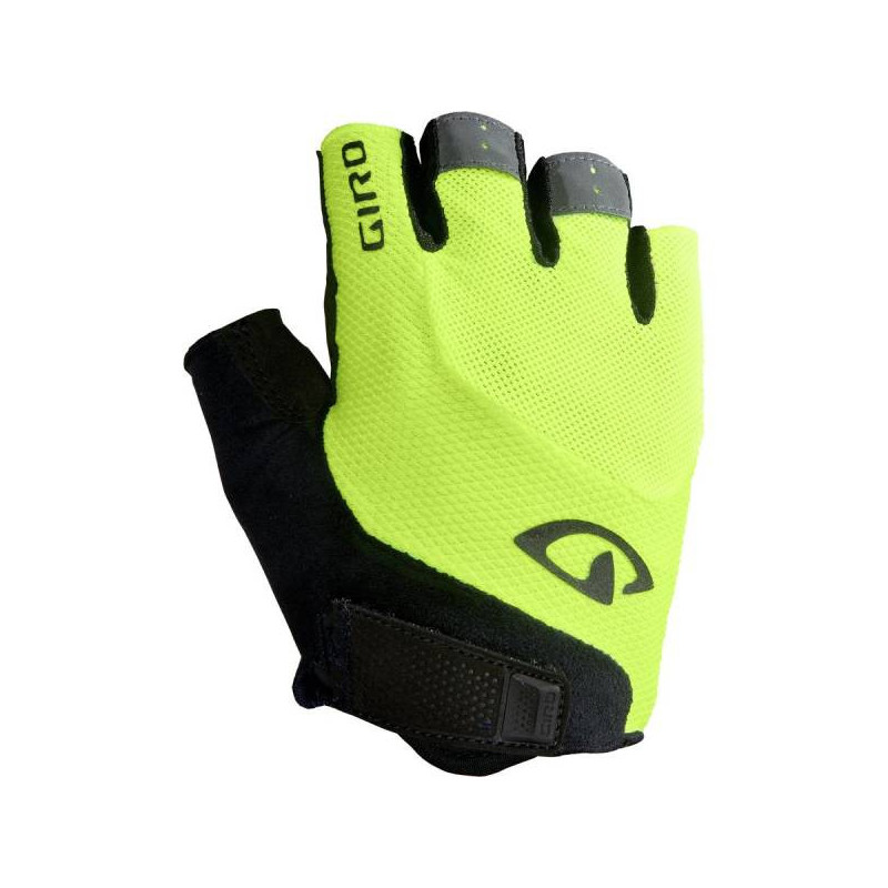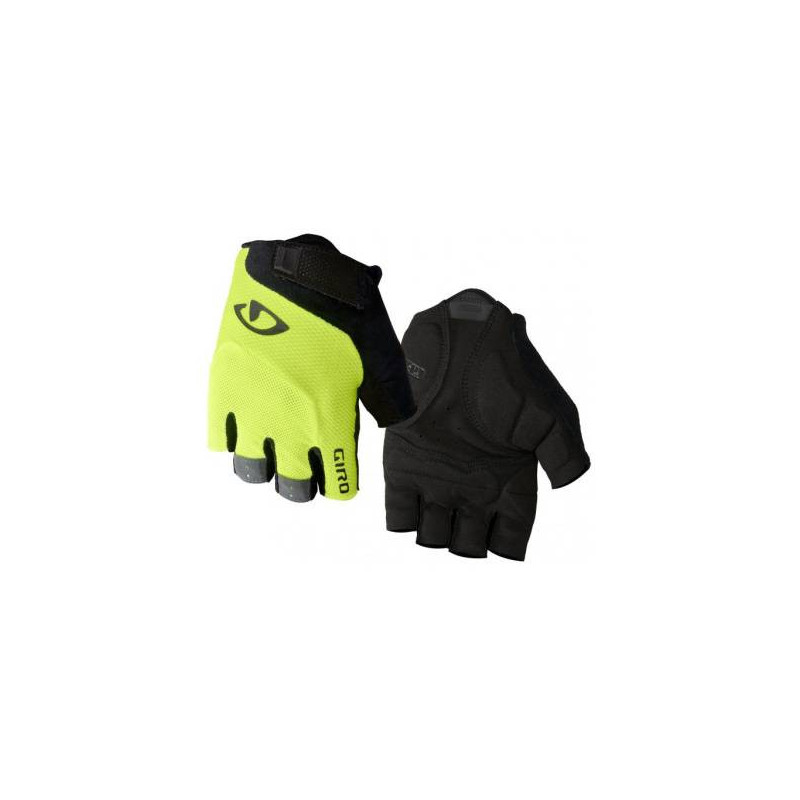 Mitaines Giro Bravo Gel jaunes : paume AX Suede® recyclée, rembourrage gel 3 mm, tissu stretch respirant, fermeture velcro, confort et grip sur routes cahoteuses.