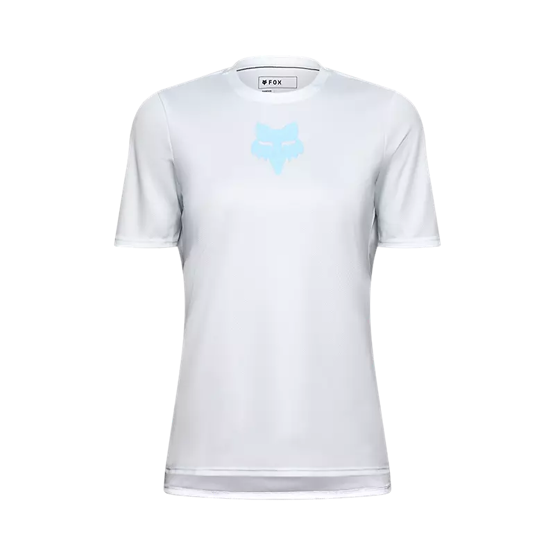 Maillot Fox Ranger Fox Head W bleu : tissu mesh recyclé, respirant et extensible, coupe VTT femme avec dos rallongé, style épuré, idéal pour trail et sorties estivales.