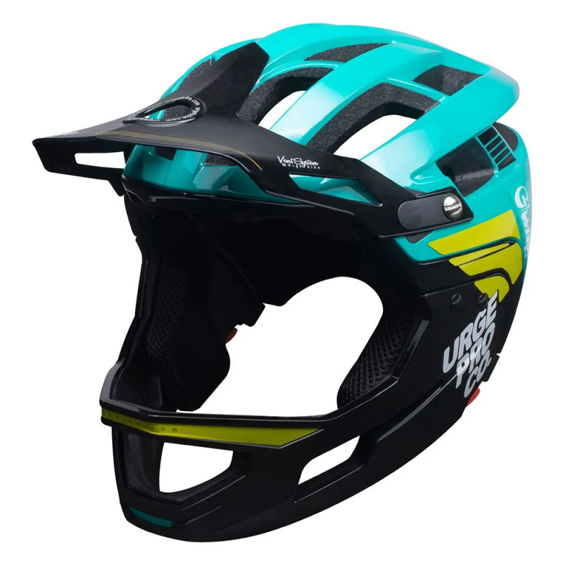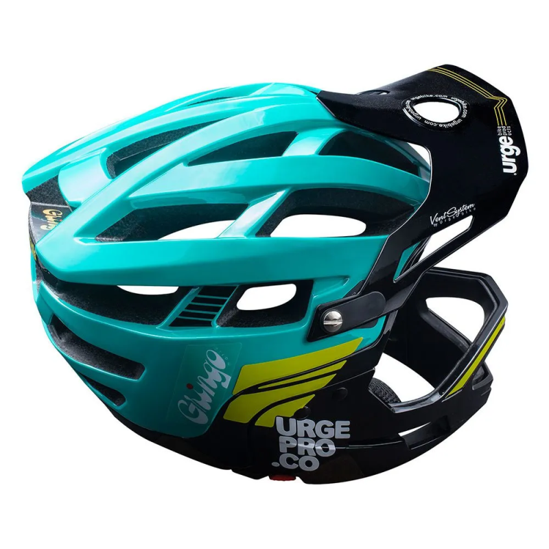 Casque VTT Urge Gringo de la Pampa : mentonnière amovible, 22 aérations, coque In-Mold en matériaux recyclés, visière ABS, réglage occipital. Idéal pour enduro, descente et trail engagé.