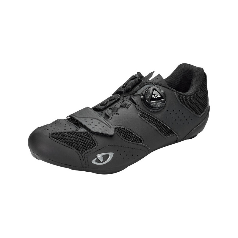 Chaussures vélo route Giro Savix II noir: tige microfibre respirante, semelle nylon injecté, serrage BOA L6 + velcro, confort EVA, compatibilité SPD/Look. Idéales pour cyclotourisme et entraînement intensif