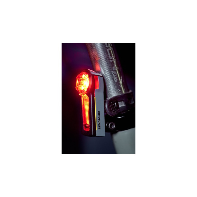 Feu arrière vélo Kryptonite Incite XBR avec capteur de freinage intelligent, visibilité optimale jour et nuit, LED haute puissance 20 lux, autonomie longue durée et recharge USB pratique pour une sécurité maximale.