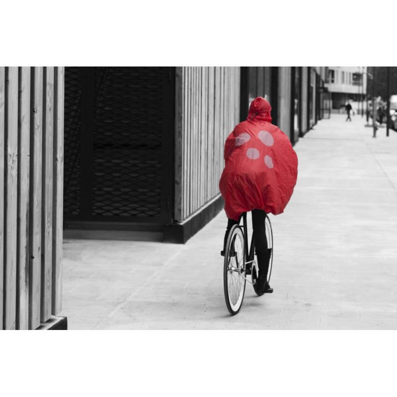 La cape se range dans un sac antivol intégré, toujours accessible en cas de pluie soudaine. Sa coupe universelle convient à tous les cyclistes, hommes ou femmes, et peut être portée par-dessus un sac à dos ou un sac bandoulière.