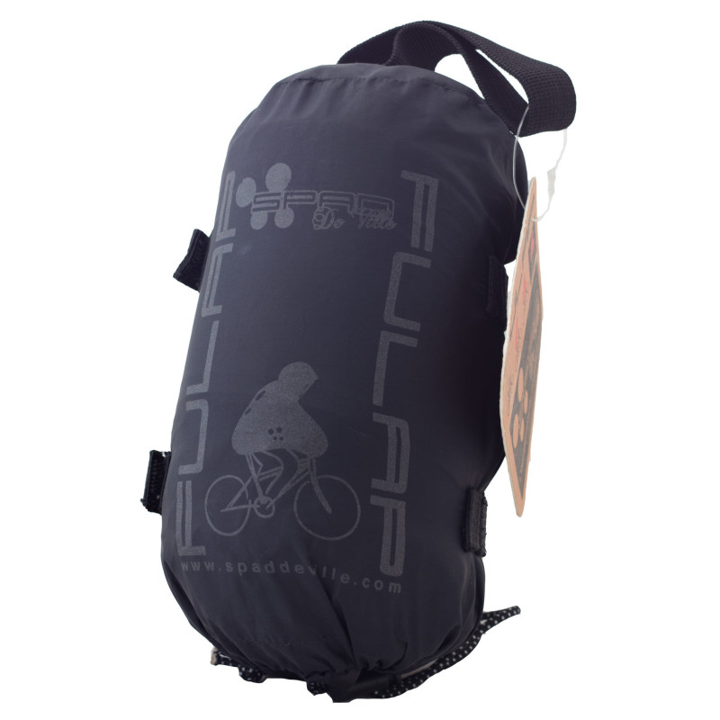 Cape de pluie vélo SPAD FULAP noir : tissu recyclé, capuche à visière, système KDS anti-envol, sac antivol intégré. Idéale pour les trajets urbains sous la pluie.