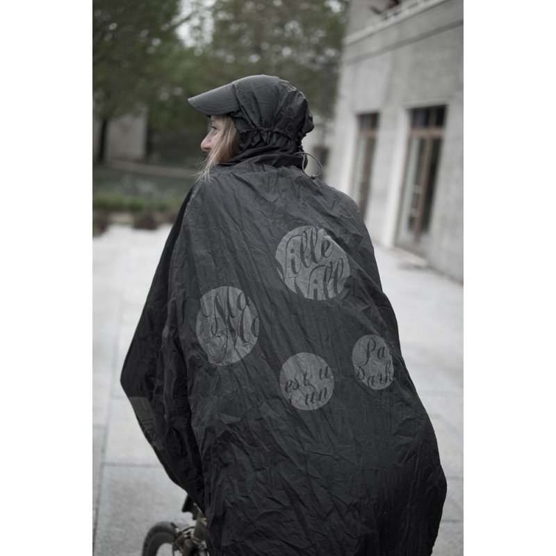 Cape de pluie vélo SPAD de Ville FULAP : protection intégrale du cycliste urbain, capuche à visière, tissu recyclé, système anti-vol, ne s’envole pas en roulant.