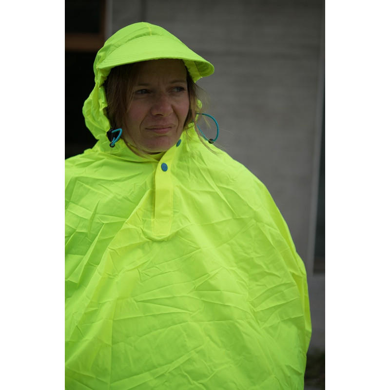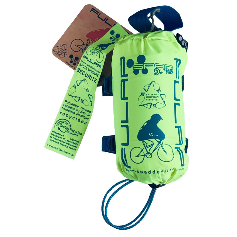 Cape de pluie vélo SPAD FULAP jaune : tissu recyclé, capuche à visière, système KDS anti-envol, sac antivol intégré. Parfaite pour les trajets urbains sous la pluie.
