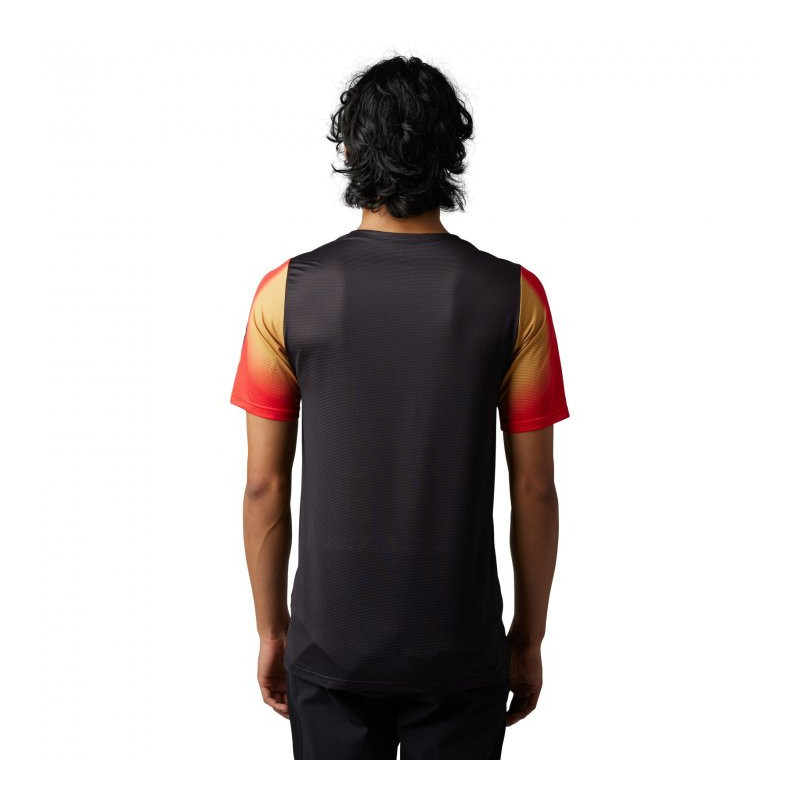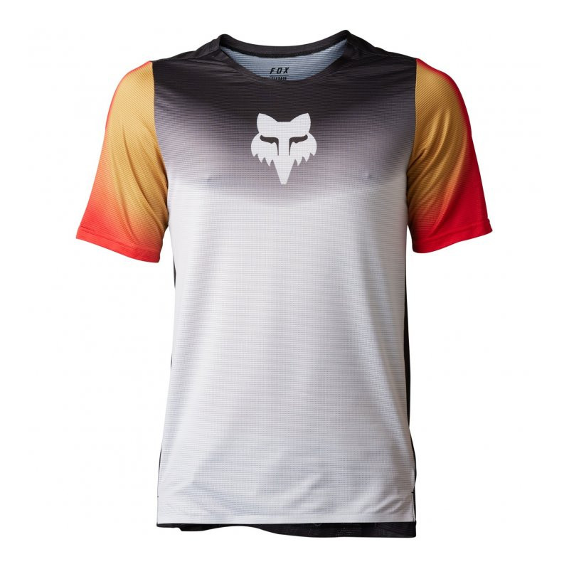 Maillot Fox Flexair Novah blanc/rouge/orange, tissu TruDri respirant, manches résistantes à l’abrasion, coupe ergonomique, perforations laser. Idéal pour VTT engagé.