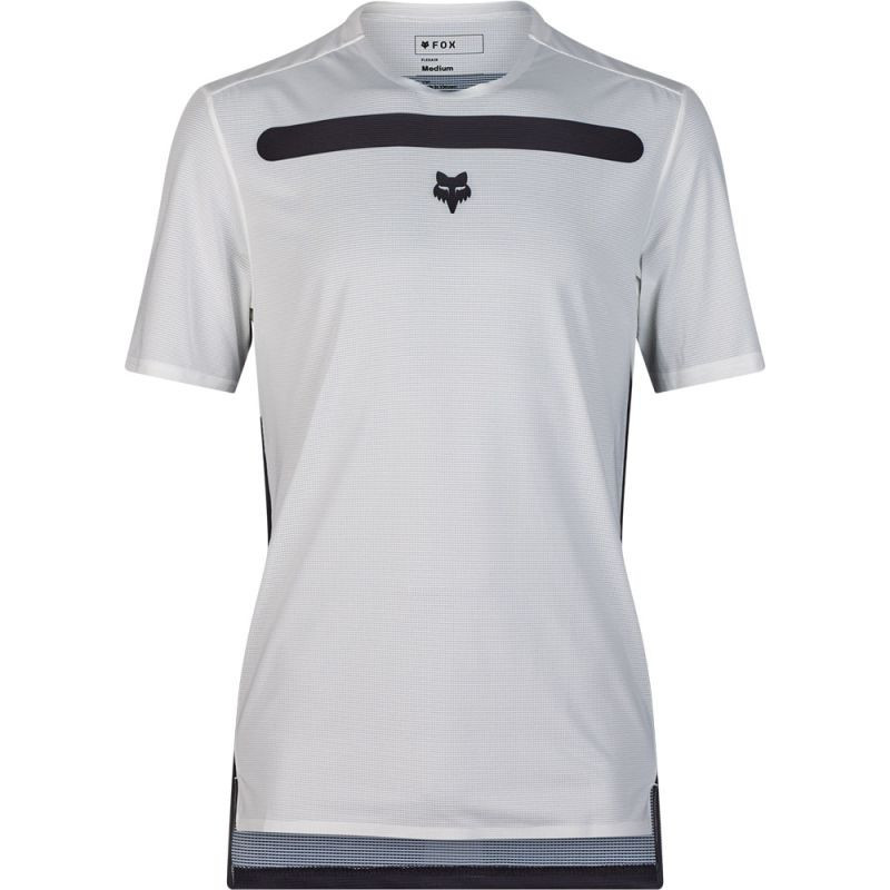 Maillot Fox Flexair Aviation blanc : tissu TruDri™, matériaux recyclés, coupe ajustée, ventilation optimisée, motifs sublimés. Léger, respirant et conçu pour la performance en trail.