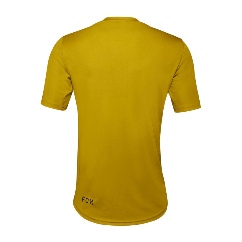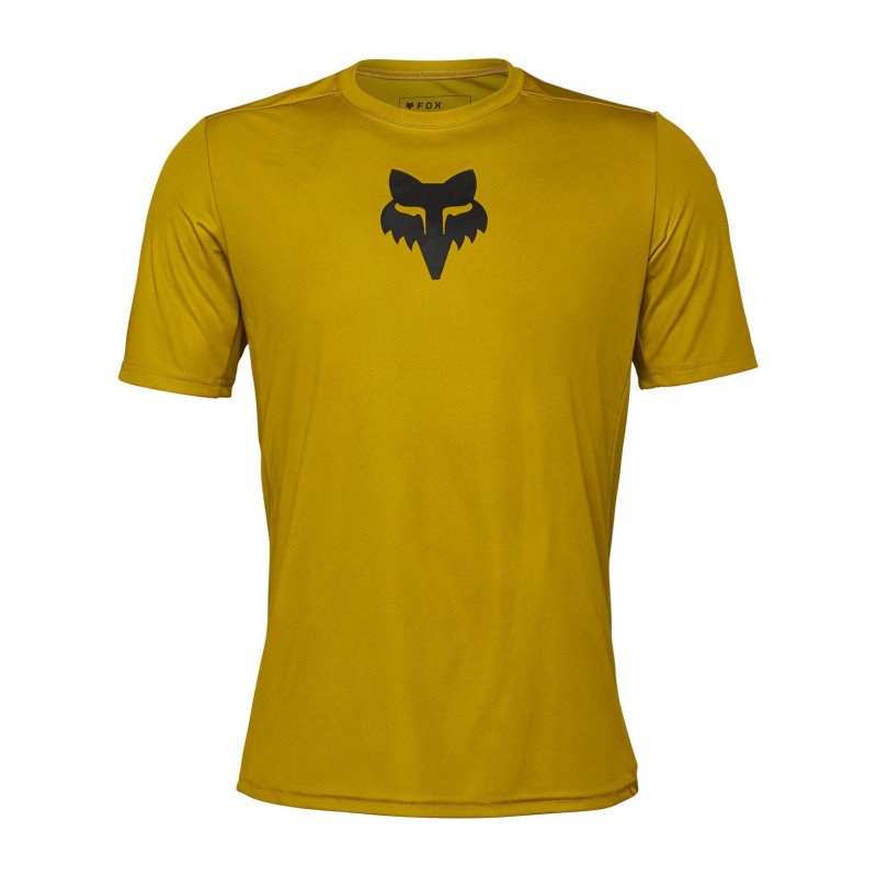 Maillot Fox Ranger Lab Head moutarde : tissu TruDri™, 100 % recyclé, coupe VTT avec dos rallongé. Respirant, stylé et confortable pour trail, enduro et all-mountain.
