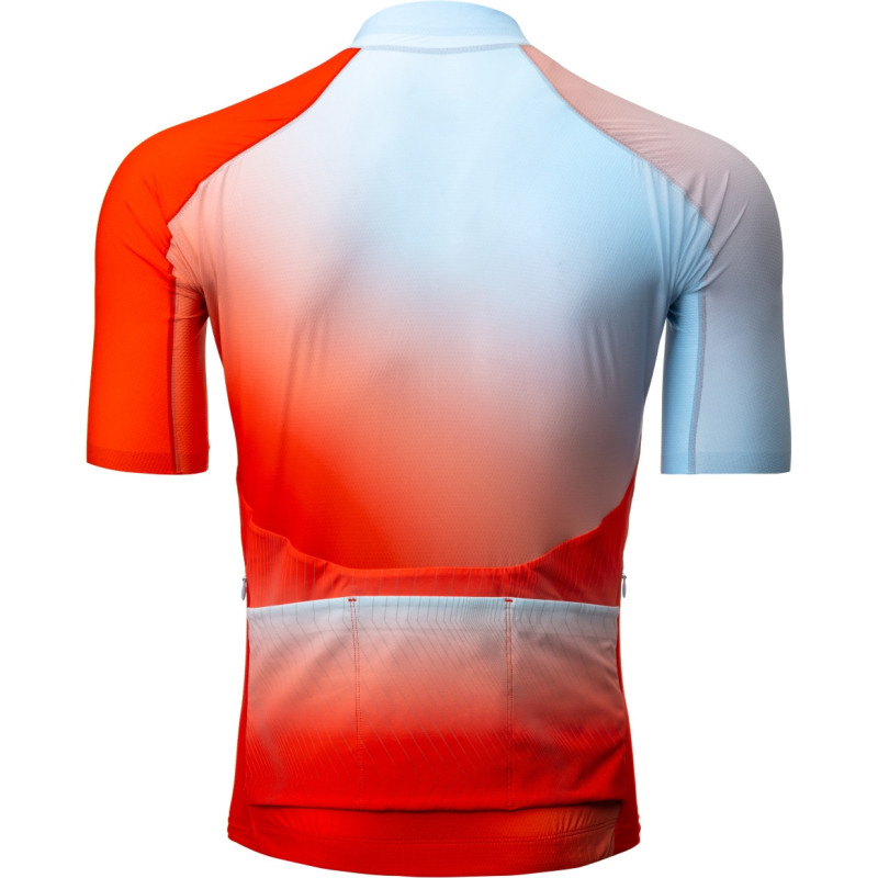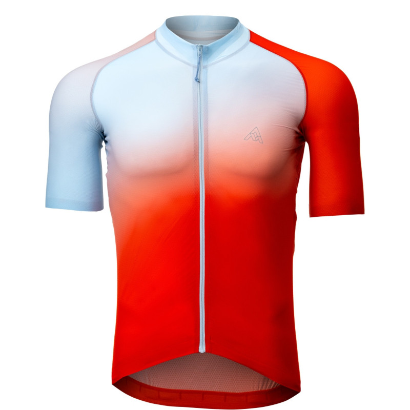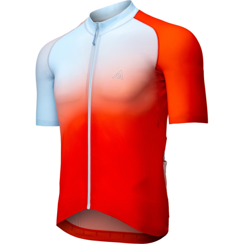 Maillot 7Mesh Horizon orange : coupe ajustée, tissu antibactérien, séchage rapide, système Anything à 5 poches, épaules roulées. Idéal pour cyclisme quotidien et longue distance.