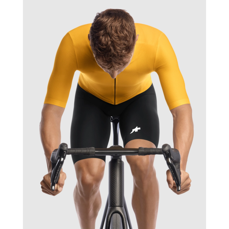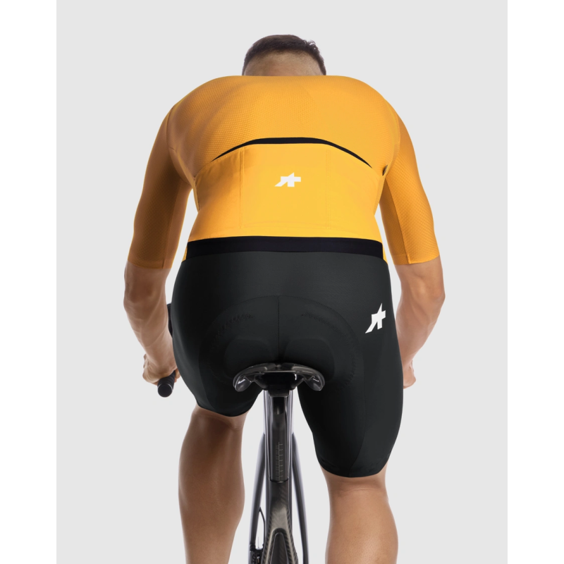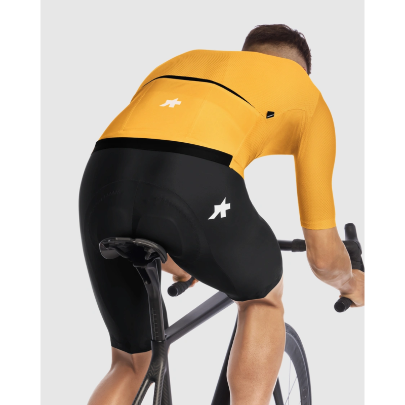 Maillot vélo Assos EQUIPE R S11 Flame Orange : ultra respirant, coupe racingFit, tissu AirCell hydrophobe, poches Triple Ramp sécurisées. Idéal pour compétitions et entraînements estivaux. Design épuré, maintien optimal, compatible système Summer 1/3.