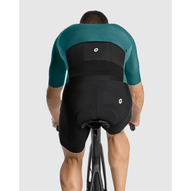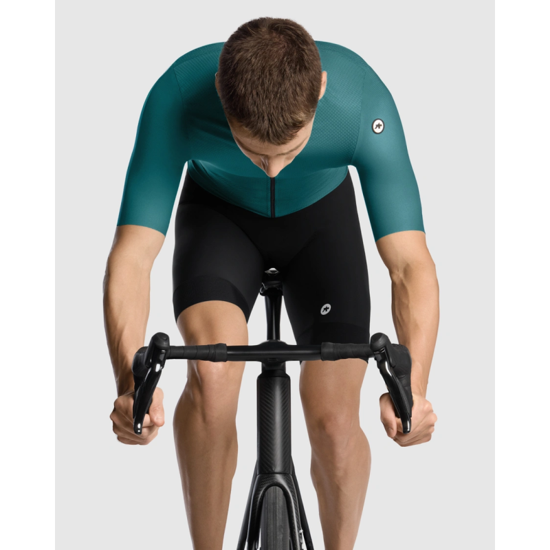 Maillot vélo Assos EQUIPE R S11 vert Halo : ultra respirant, coupe racingFit, tissu AirCell hydrophobe, poches Triple Ramp sécurisées. Idéal pour entraînements et compétitions estivales. Design épuré, maintien optimal, compatible système Summer 1/3.