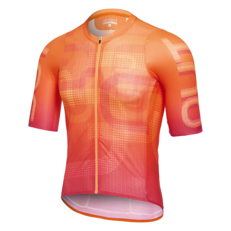 Maillot vélo Dotout Ultralight orange, ultra respirant et léger. Coupe anatomique, tissu technique et finition compressive pour performance maximale par temps chaud.
