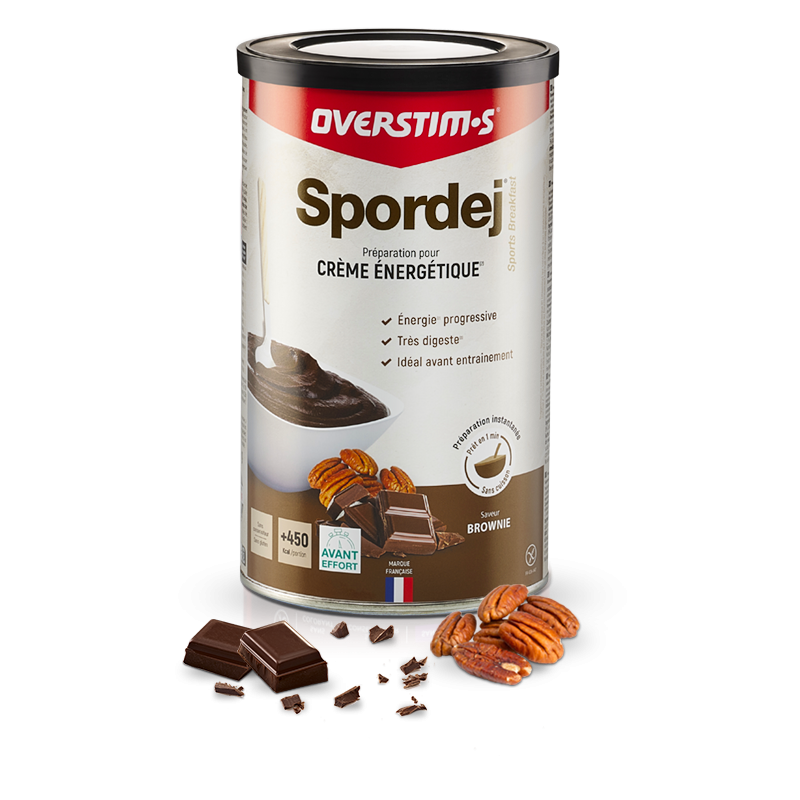 Spordej Overstims Brownie 600g : crème énergétique sans gluten, digeste et gourmande, idéale avant l’effort pour un apport durable en glucides complexes.