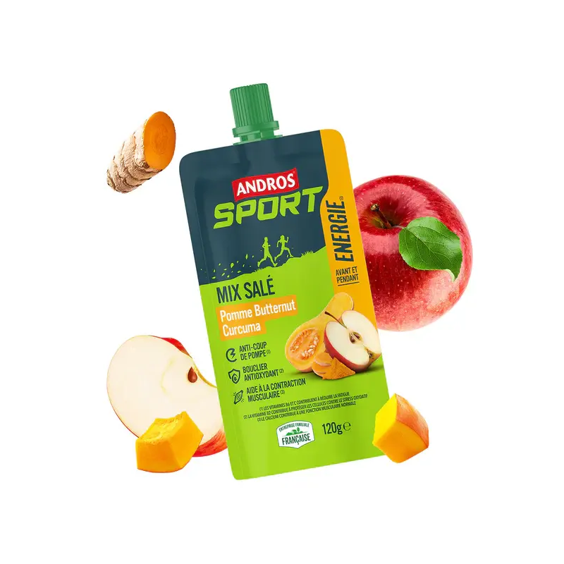 Gourde Andros Sport salée 120g pomme-butternut-curcuma, 102 kcal, 20 g de glucides, vitamines B et E, calcium. Texture fluide, digestion facile, énergie naturelle pendant l’effort.