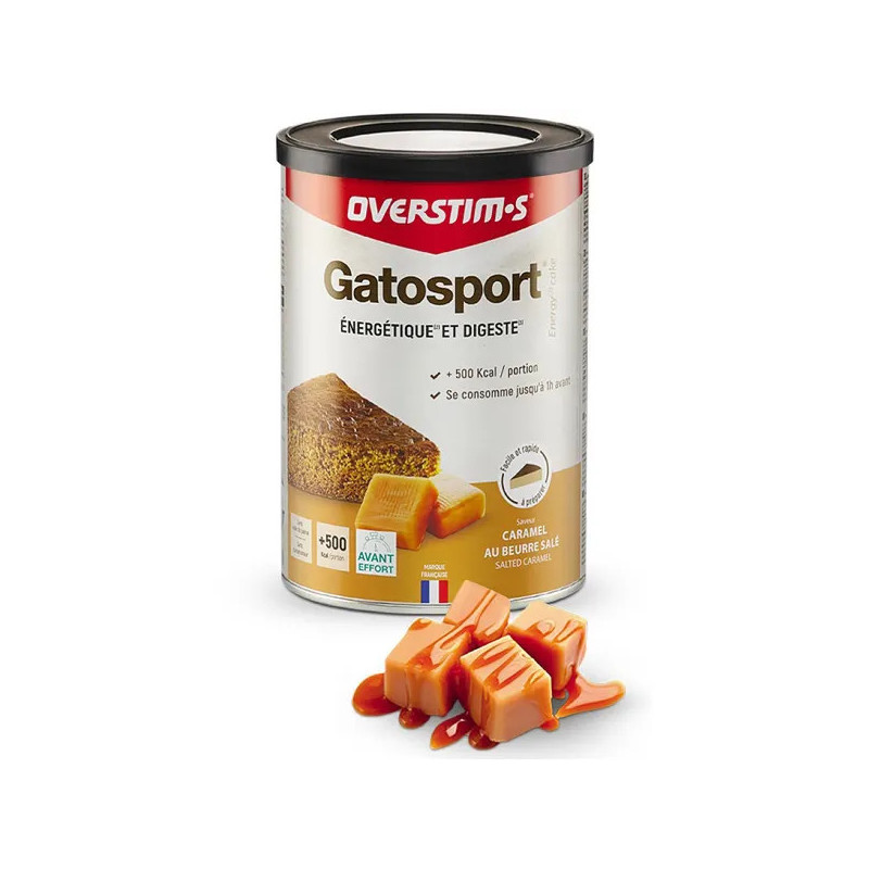 Gatosport Overstims caramel beurre salé 400g : gâteau énergétique sans gluten, digeste et riche en glucides complexes, idéal avant l’effort pour endurance et performance.