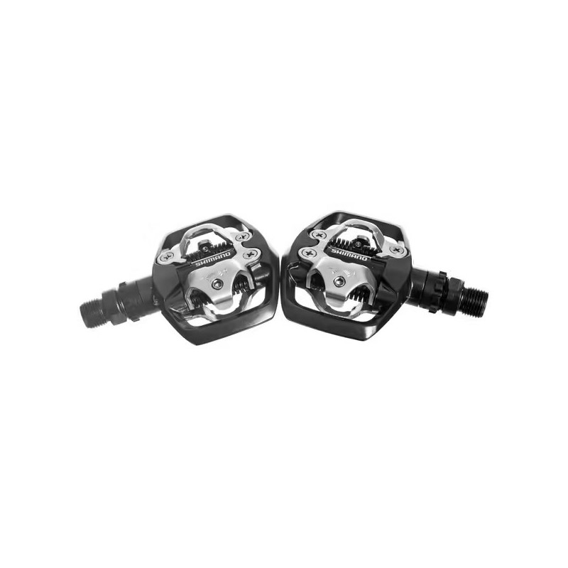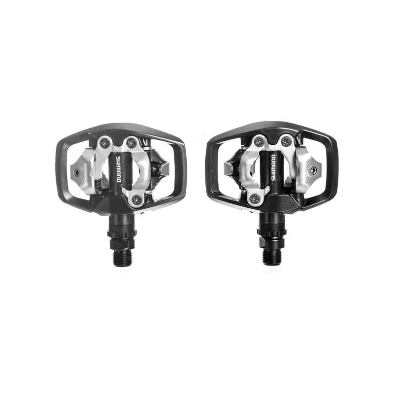 Pédales Shimano PD-ED500 : automatiques double face, légères et fiables, avec tension réglable et ressorts souples pour un enclenchement facile, idéales pour ville, VTT loisir et cyclotourisme.