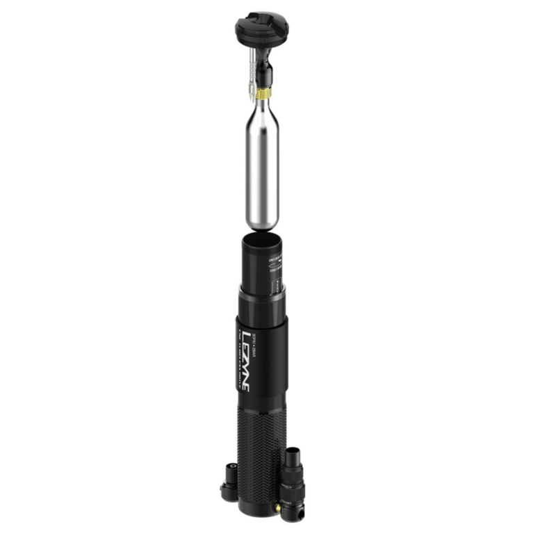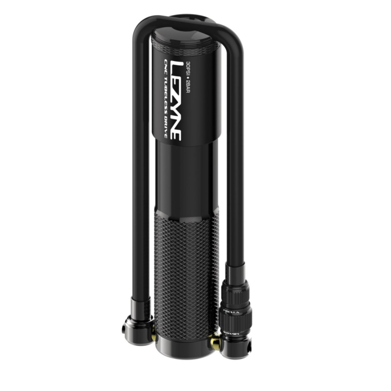 Lezyne CNC Tubeless Drive : pompe manuelle haut de gamme en aluminium usiné CNC, compacte et robuste, conçue pour le montage tubeless, avec réservoir intégré et compatibilité Presta/Schrader.