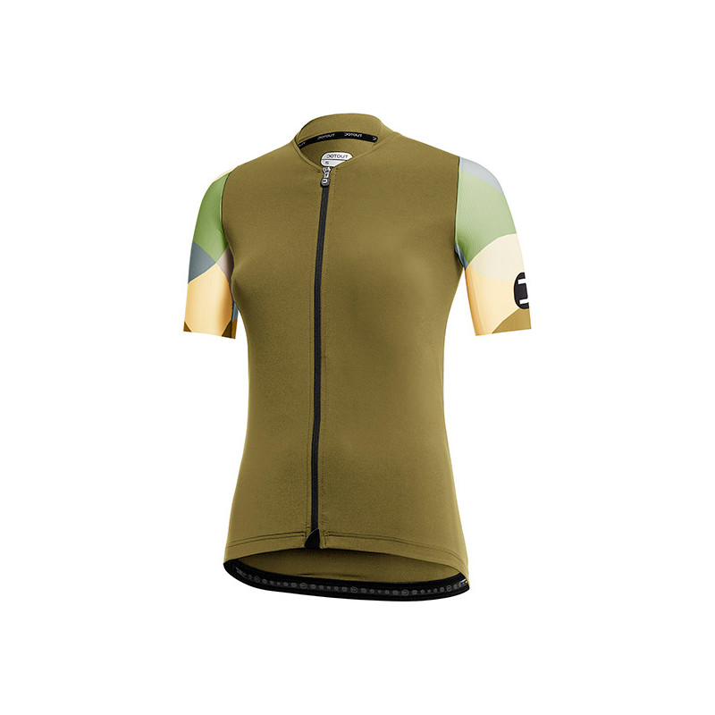 Maillot Dotout Patch W moutarde, coupe féminine, tissu stretch respirant, encolure V ergonomique, look tendance et dynamique. Confort et style pour cyclistes actives.