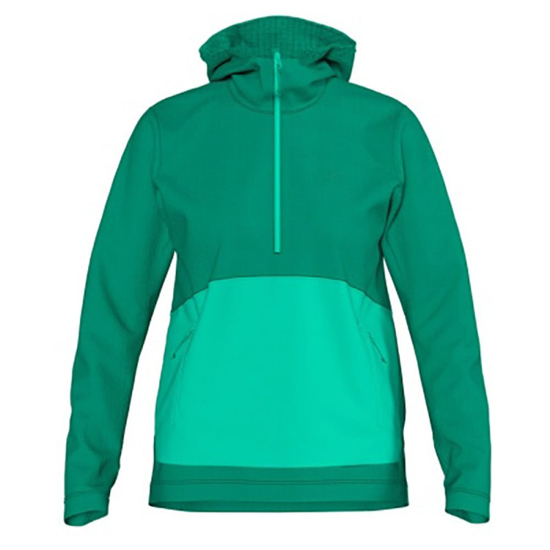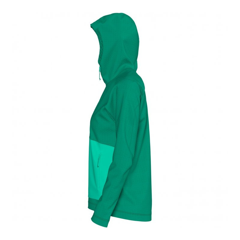 Veste thermique femme 7Mesh Chilco Anorak verte, idéale pour les sorties vélo par temps frais. Isolation WTV, coupe-vent, capuche compatible casque, poches pratiques, logos réfléchissants.