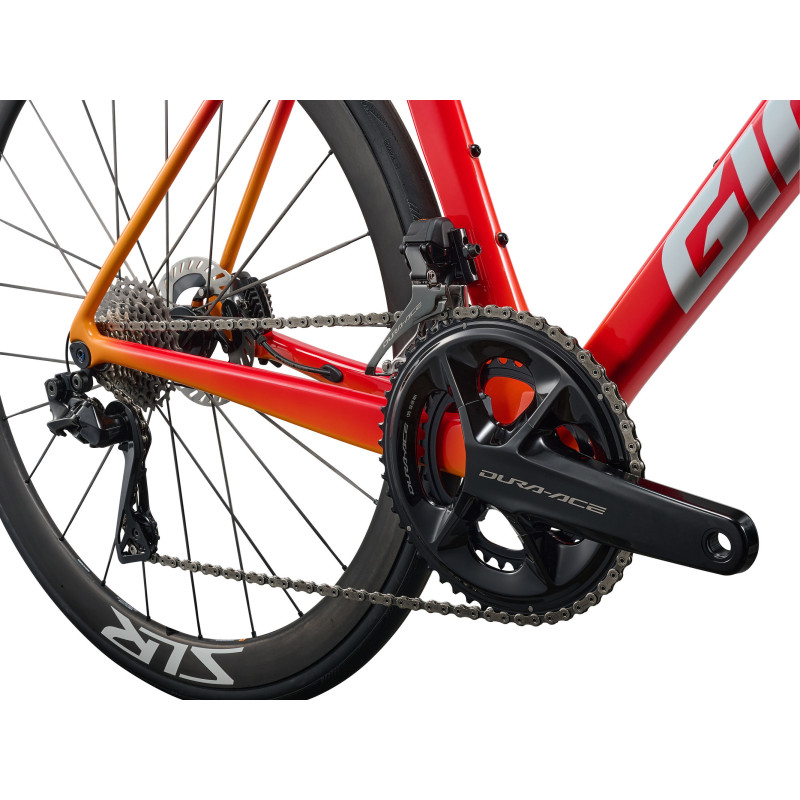 Ce modèle est équipé du groupe Shimano Dura-Ace Di2, référence mondiale en matière de transmission électronique. Les passages de vitesses sont instantanés et précis, même sous forte charge, tandis que les freins hydrauliques assurent un contrôle optimal en descente et dans les conditions les plus exigeantes. Les roues Giant SLR 0 40 tubeless complètent l’ensemble, offrant une meilleure adhérence, moins de crevaisons et une résistance au roulement réduite.