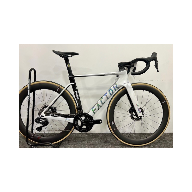 Vélo route aéro ultra-léger Factor Ostro VAM 2.0 blanc, équipé Shimano Dura-Ace Di2, roues Reserve Aero, cadre carbone haut de gamme. Vitesse et précision.